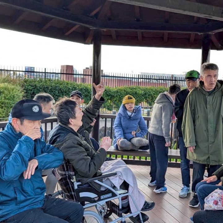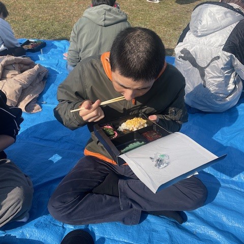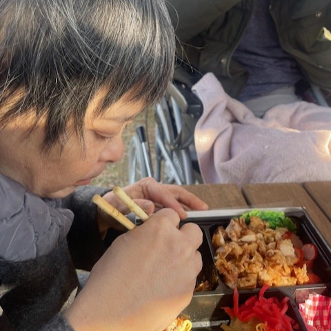 1月21日、つるみの郷の利用者さん全員でスカイランドへ久しぶりのピクニックに出かけました。到着後は散策や日向ぼっこなど、それぞれが思い思いにのんびり過ごし、屋外での時間を楽しみながらリフレッシュできた様子でした。お昼には錦糸たまごや海苔がのったご飯、ほうれん草の和え物、ハンバーグ、唐揚げ、ウインナーが入ったボリューム満点のお弁当を青空の下で味わい、皆さん笑顔があふれていました。今回、利用者さん全員で外出できたことはとても良い機会となり、今後も少人数でも外出の機会をつくり、リフレッシュできる時間を大切にしていきたいです。
