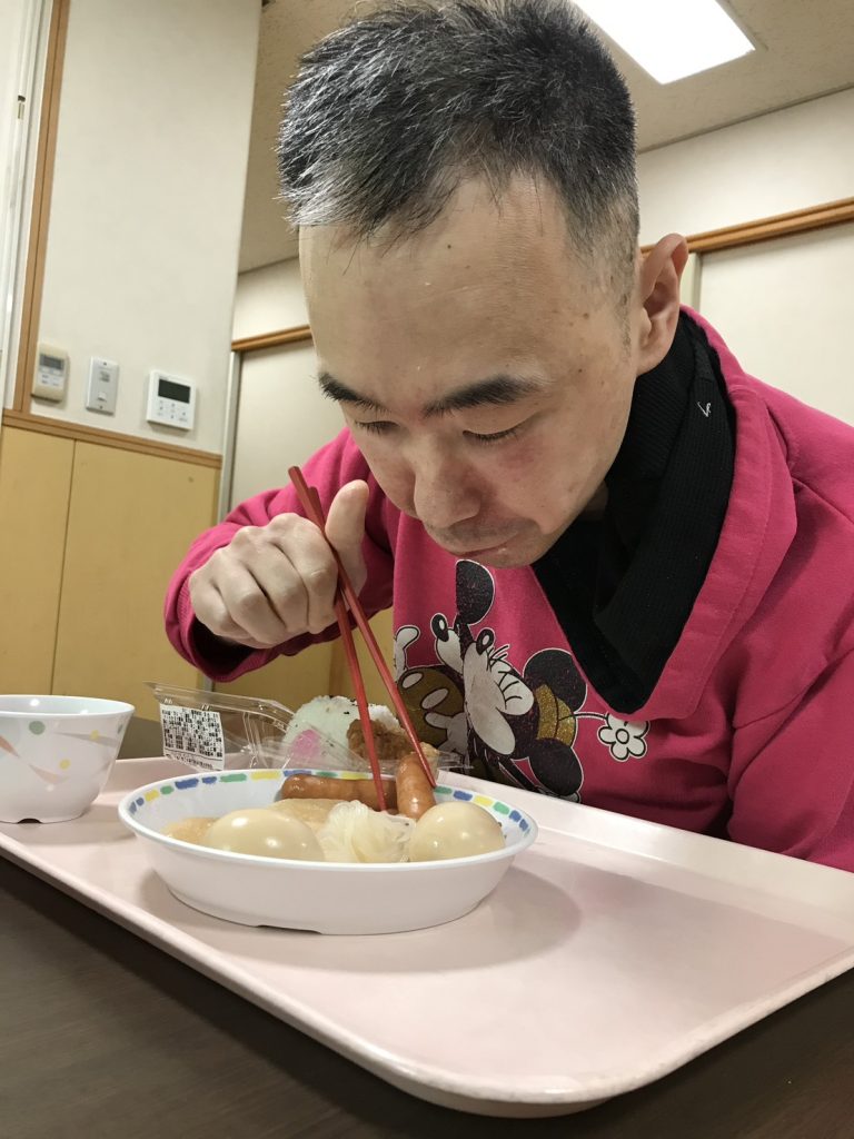 当日はカセットコンロを使い、レトルトのおでんを温め、さらにウインナーやはんぺん、うどんを追加しました。できたての熱々のおでんを「ふうふう」と冷ましながら、おなかいっぱい味わいました。